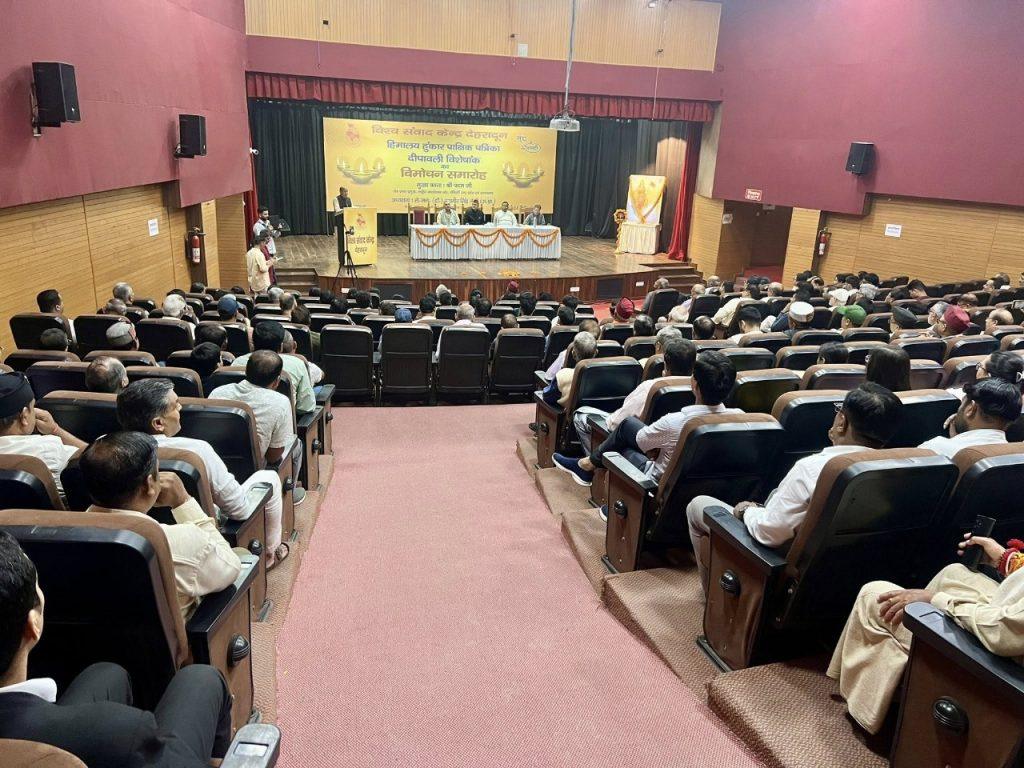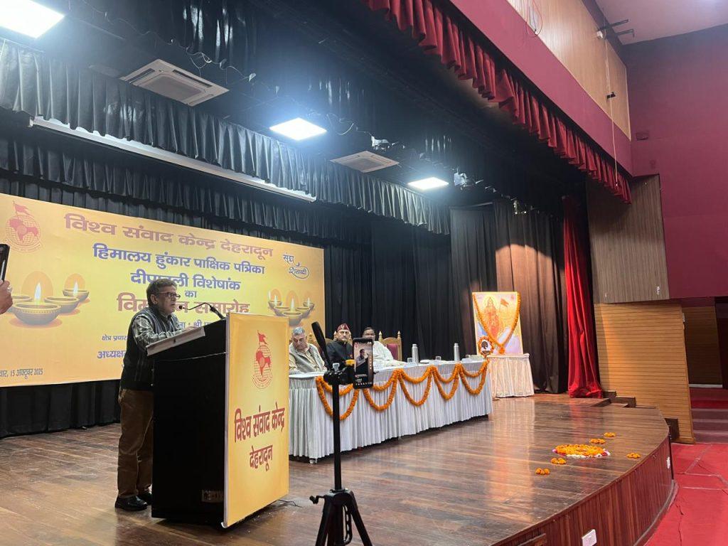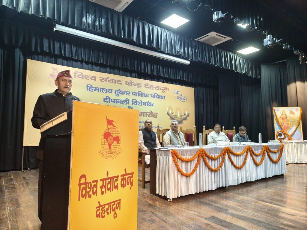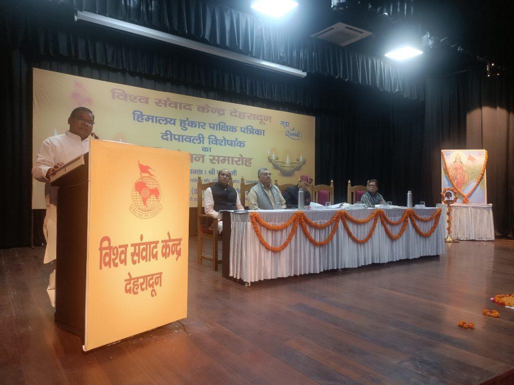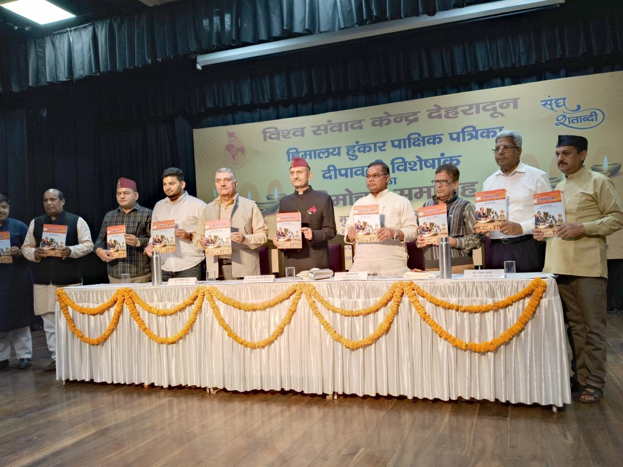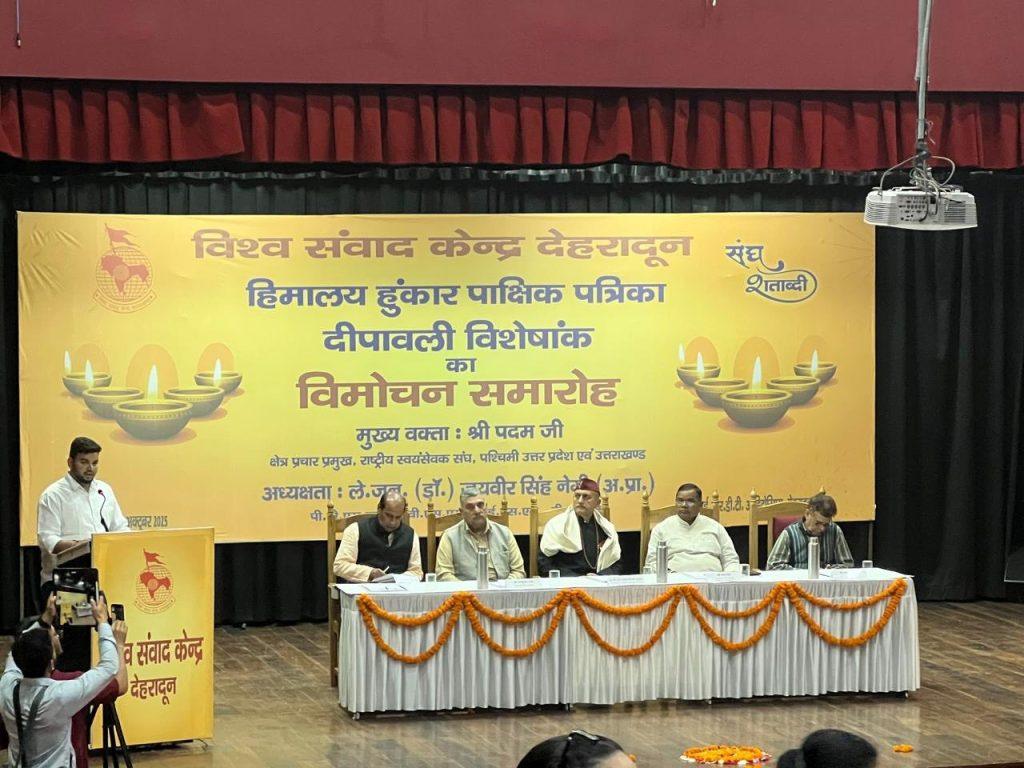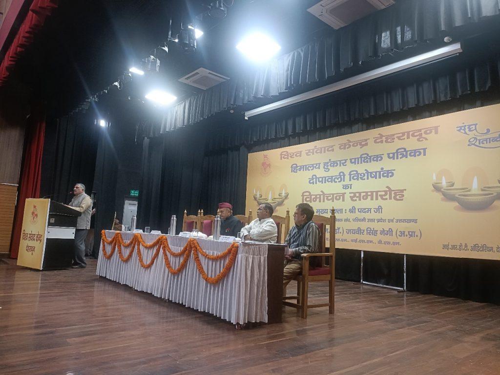 आज विश्व संवाद केंद्र, देहरादून द्वारा प्रकाशित हिमालय हुंकार पाक्षिक पत्रिका के दिवाली विशेषांक ‘धर्मो रक्षति रक्षित: भारतीय संविधान अनुच्छेद 26 विविधता से अखंडता तक’ का विमोचन समारोह आई. आर. डी. टी. सभागार, देहरादून में संपन्न हुआ। कार्यक्रम के मुख्य वक्ता राष्ट्रीय स्वयंसेवक संघ के क्षेत्र प्रचार प्रमुख श्रीमान पदम जी तथा कार्यक्रम अध्यक्ष लेफ्टिनेंट जनरल (सेवानिवृत्त) डॉ. जयवीर सिंह नेगी जी रहे।